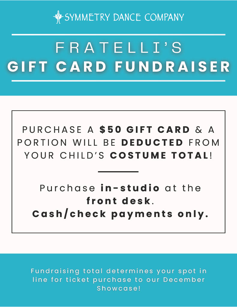 We’re bringing back Fratelli’s gift cards! A huge thank you to a former dance dad, Jeremy Morris for working with us again! Fratelli’s is a fantastic local, family-owned restaurant — and they’re even open on Monday evenings when many other restaurants are closed.